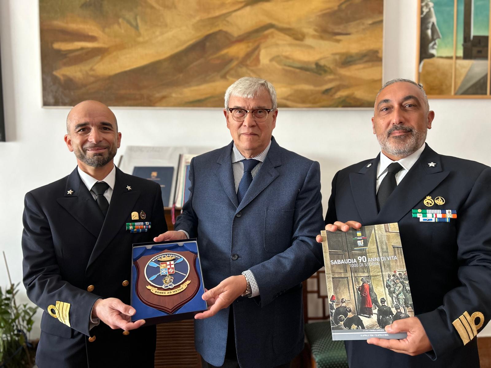 Mattinata di divise e strette di mano al Comune di Sabaudia. Il sindaco Alberto Mosca ha ricevuto il capitano di fregata Massimiliano Caramia, nuovo comandante del Centro Sportivo Remiero della Marina Militare, accompagnato dal suo predecessore Francesco Murzi.