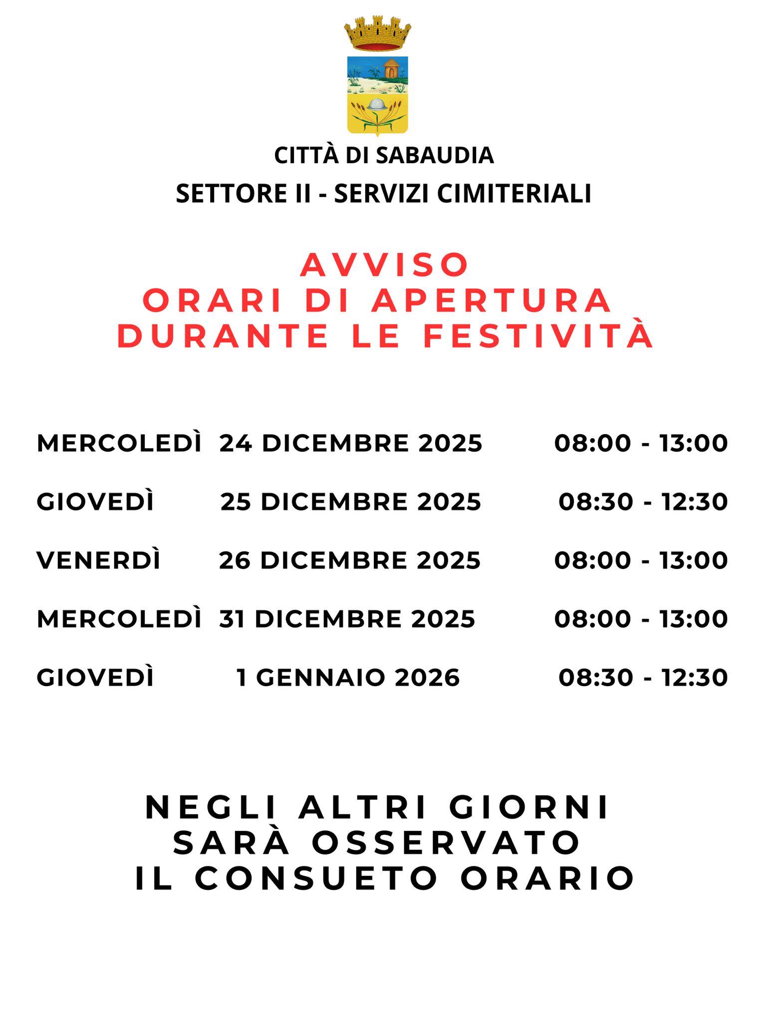 Si informa la cittadinanza che, a causa dell’interruzione del flusso idrico comunicata da Acqualatina SpA su tutto il territorio comunale, gli uffici del Comune di Sabaudia resteranno chiusi per l’intera giornata di martedì 9 dicembre 2025.